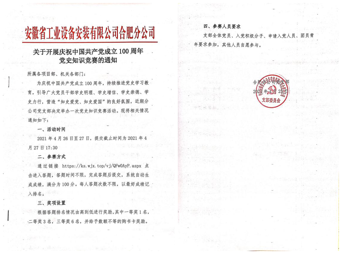為慶祝中國共產黨成立100周年,持續推進黨史學習教育,引導分公司黨員干部學史明理、學史增信、學史崇德、學史力行,營造“知史愛黨、知史愛國”的良好氛圍,4月26日-27日,合肥分公司黨支部組織開展了黨史學習教育知識競賽活動。