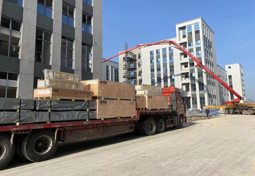 長淮衛鎮派出所項目電梯到貨,現場施工人員正在準備卸貨