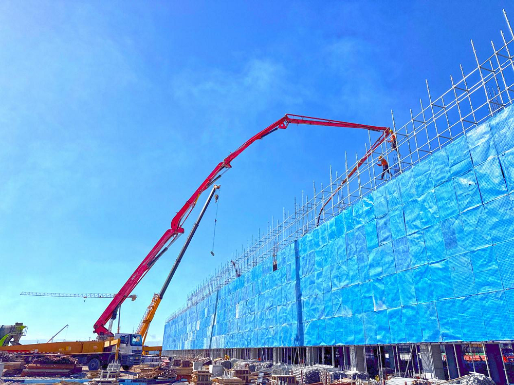 截至目前,廠房鋼結構完成1500噸建設量,獨立基礎、條形基礎全部完成,設備基礎正在施工;變電所二層主體施工完成,三層主體正在施工。