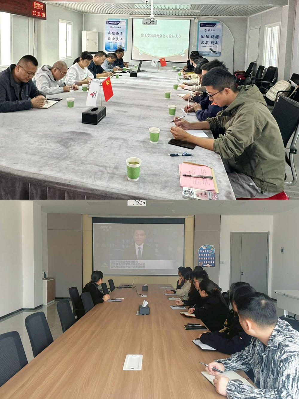 近日,建工安裝滁州分公司黨支部分別在機關(guān)和項目一線召開會議,專題傳達(dá)學(xué)習(xí)習(xí)近平總書記考察安徽重要講話精神,分公司領(lǐng)導(dǎo)班子成員、黨員、機關(guān)及所屬項目部員工參會。