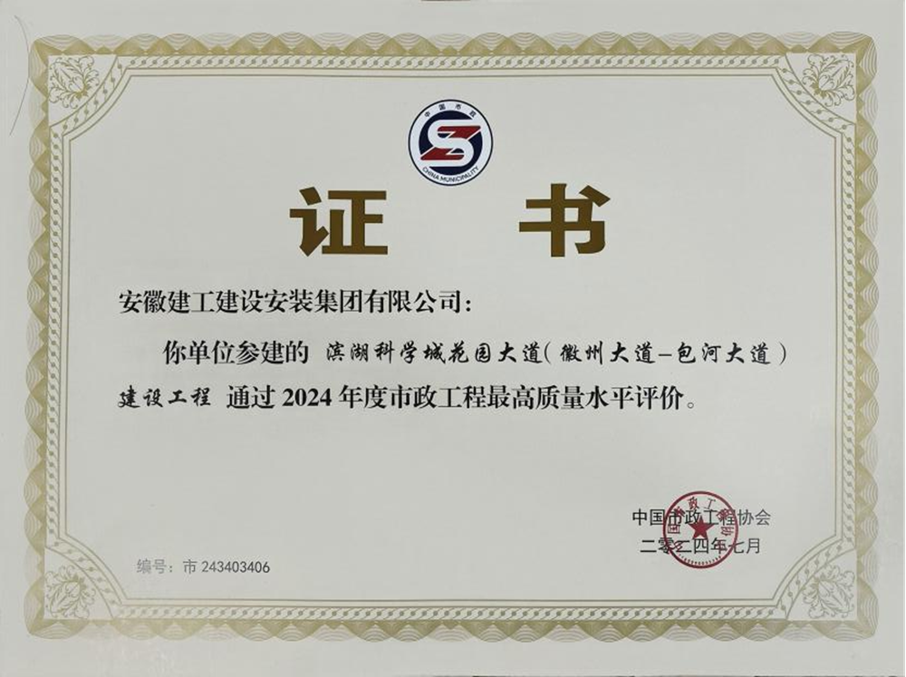 近日,中國市政工程協會頒發了2024年度市政工程最高質量水平評價獎證書,建工安裝合肥分公司濱湖科學城花園大道(徽州大道-包河大道)建設工程項目榮獲市政工程最高質量水平評價獎,這是本項目繼榮獲“華東優質安裝工程獎”、“黃山杯”之后的又一國家級獎項。
